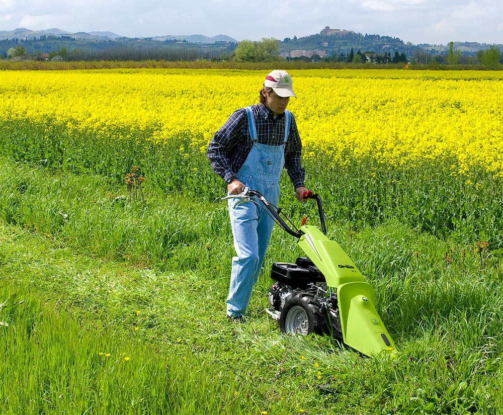 Der Grillo GF2 ist ein perfekt ausbalancierter Motor-Balkenmäher, Motor und Zapfwelle sind so positioniert, so dass eine Bodenfreiheit gewonnen wurde, die auch ideal zum Mähen an Hängen ist.