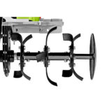 Robuste Komponenten und flexible Einstellungen Die aus gehärtetem Stahl gebauten Hacken sind durch Bolzen befestigt. Der Sechskantschaft hat einen Sechskant von 27 mm. Das Gehäuse des Fräsgetriebes ist verschraubt, um evtl. Wartungsarbeiten durchzuführen. Der Sporn lässt sich in der Höhe in 8 Stellungen einstellen und ist schwingend. |