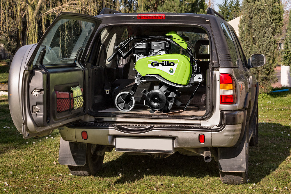 Praktisches Vorderrad für einfachen Transport Das serienmäßig vorliegende Vorderrad begünstigt den Transport dank einer praktischen Vorrichtung mit Feder, welche sie in Arbeits- oder Transportstellung blockiert. Dank des reversiblen Lenkholms und der kompakten Ausmaße können die Grillo Princess Motorhacken leicht im Auto transportiert werden. |