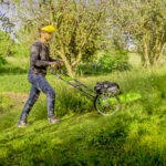 Der Trimmer – Fadenmäher ist mit Antrieb bestückt und erlaubt das bequeme Arbeiten auch bei unebenem Boden und in Hanglage. |