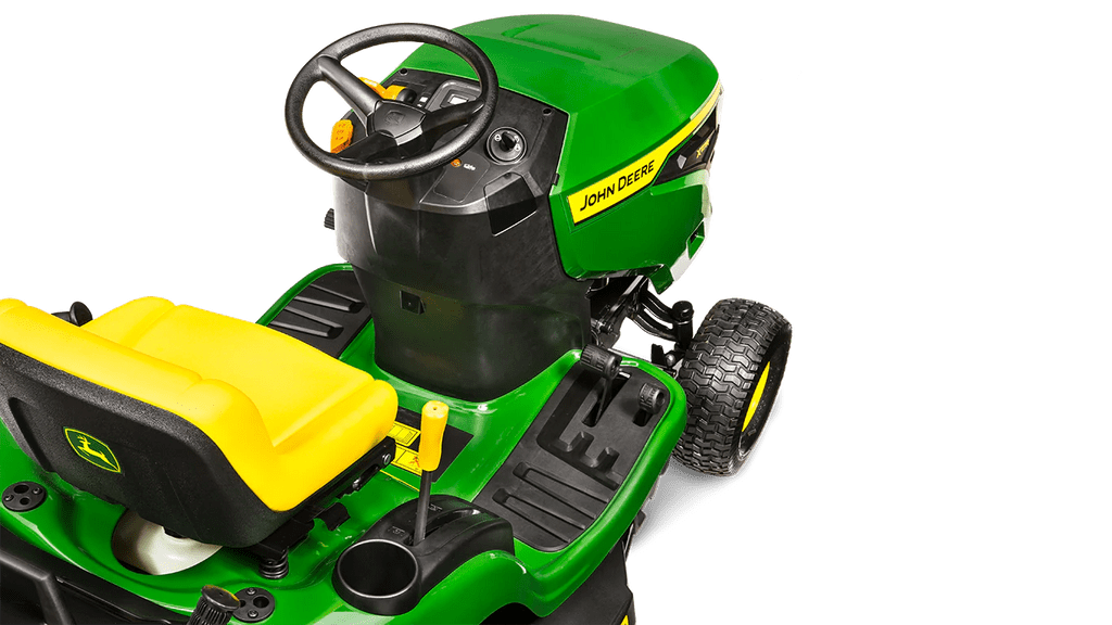 Unser Rasentraktor X117R mit Sammel-/Auswurfsystem am Heck ist mit einem Einzylindermotor, einem Hydrostatikgetriebe mit bedienerfreundlicher Fußpedalsteuerung und einem 92-cm-Mähwerk ausgestattet. Der 300-l-Grasfangbehälter lässt sich schnell abnehmen und durch einen optional erhältlichen Deflektor oder Mulcheinsatz austauschen, wenn das Material nicht eingesammelt werden soll.