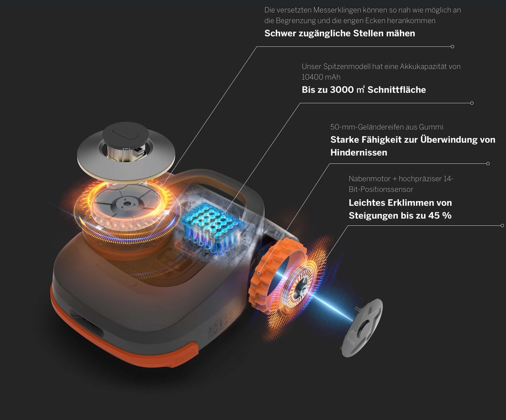 | Elektrische Schnitthöhenverstellung NAVIMOW ist mit einem Elektromotor für die Messerscheibe ausgestattet. 7 Schnitthöhen von 30 mm bis 60 mm sind verfügbar, die Sie einfach über die NAVIMOW-App einstellen können. |