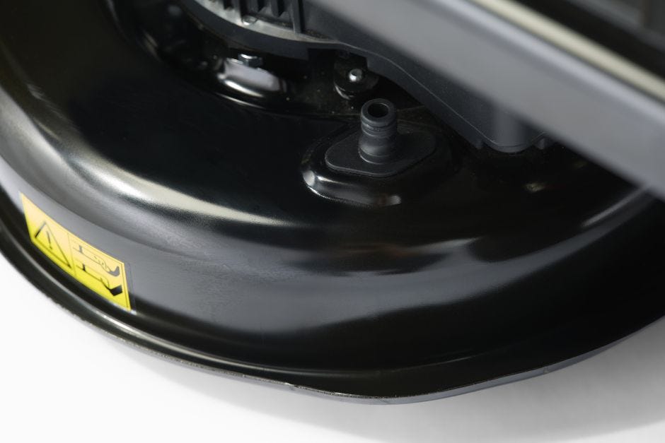 Der innovative Reinigungsanschluss – erstmal auch bei einem E-Traktor – ermöglicht dir eine einfache Reinigung des Mähwerks mithilfe eines Wasserschlauchs. Schutzart IP 65. |